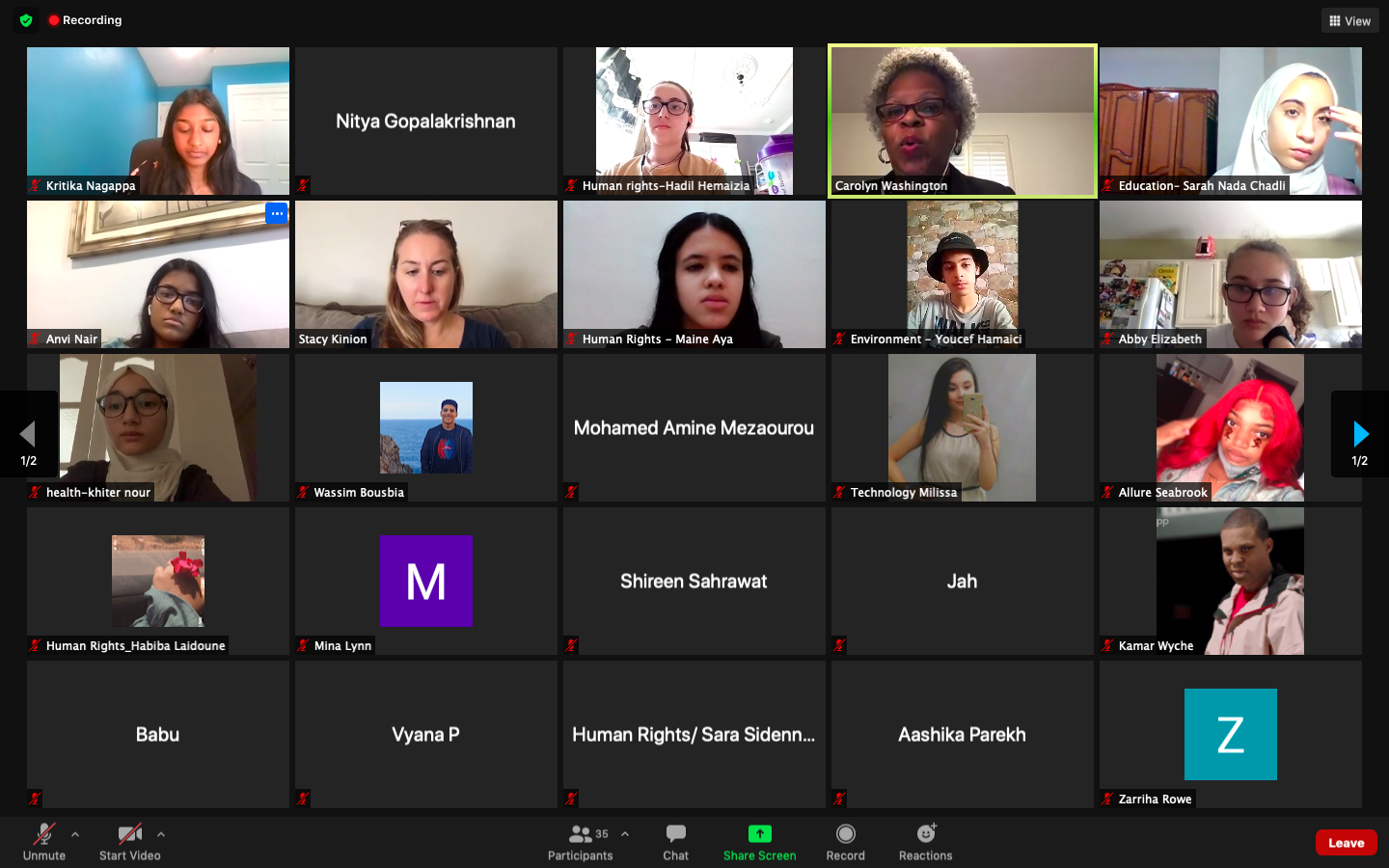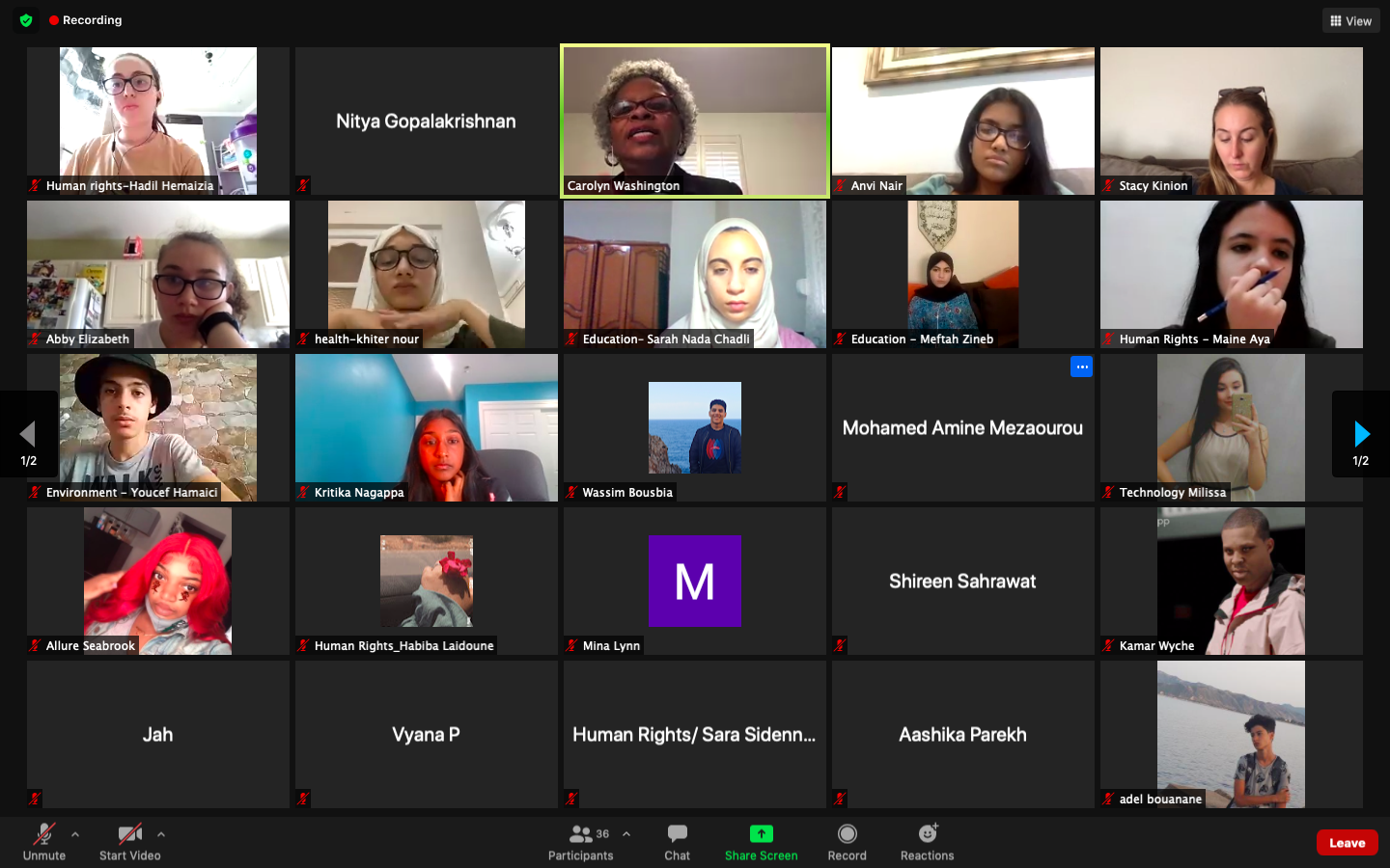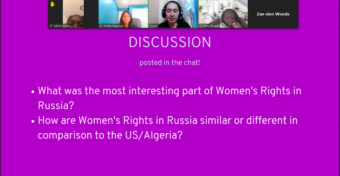 A virtual exchange for girls from Newark, Algeria, and Russia, centered around women's rights around the world, and how the issue is the same but also different globally. We had the opportunity to speak with Dr. Carolyn Washington. She has a Ph.D. in global gender studies. She co-chairs the Women of Color Advancing Peace and Security (WCAPS) Defense and Intelligence working group and is a retired US Army officer. She was able to share her personal experiences from her time serving the country and the U.S. Government as a woman of color.